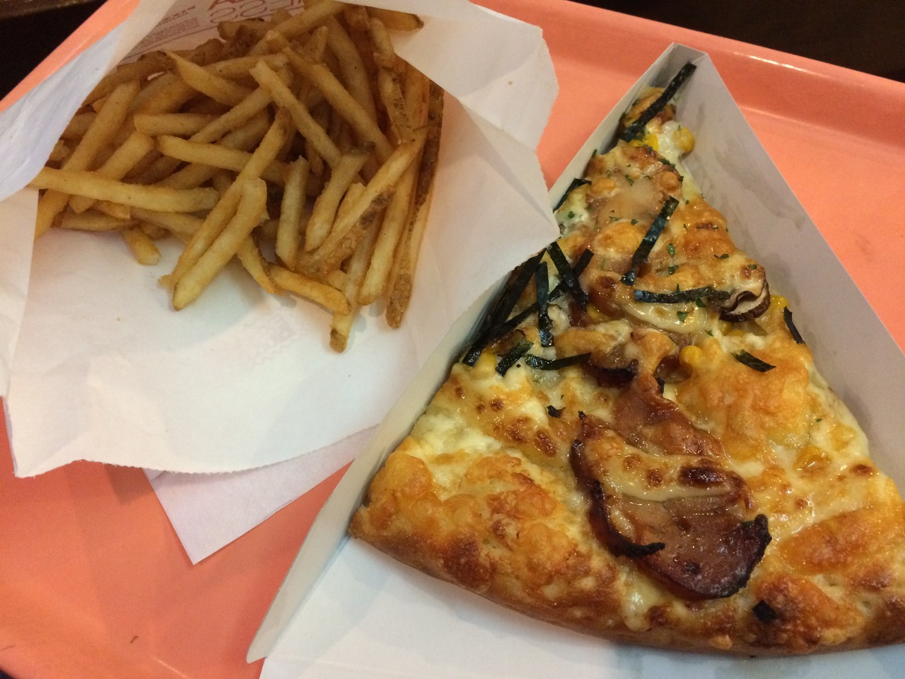 子供がポテトが食べたいということで、ピザ1ピースとポテト付きのAセットにしました。税込み520円で、施設内のお店としては安くてお得♪しかも、テリヤキチキンのピザがとても美味しかったです☆