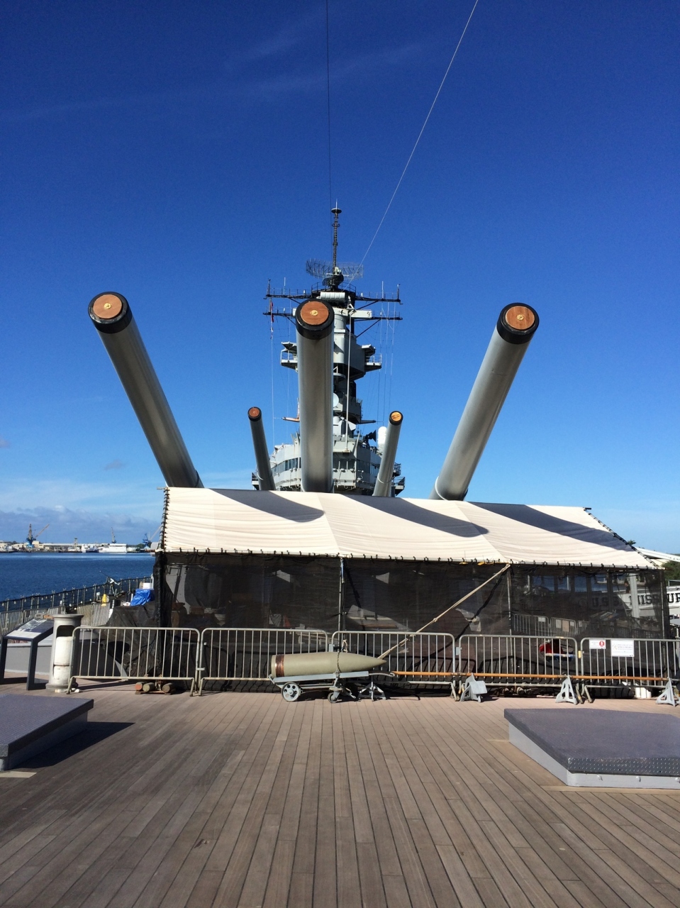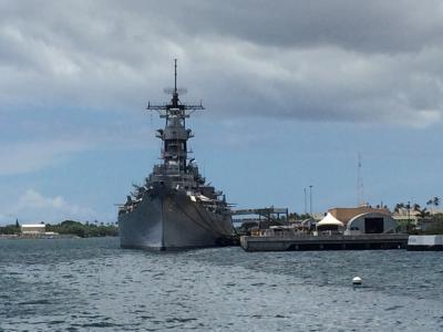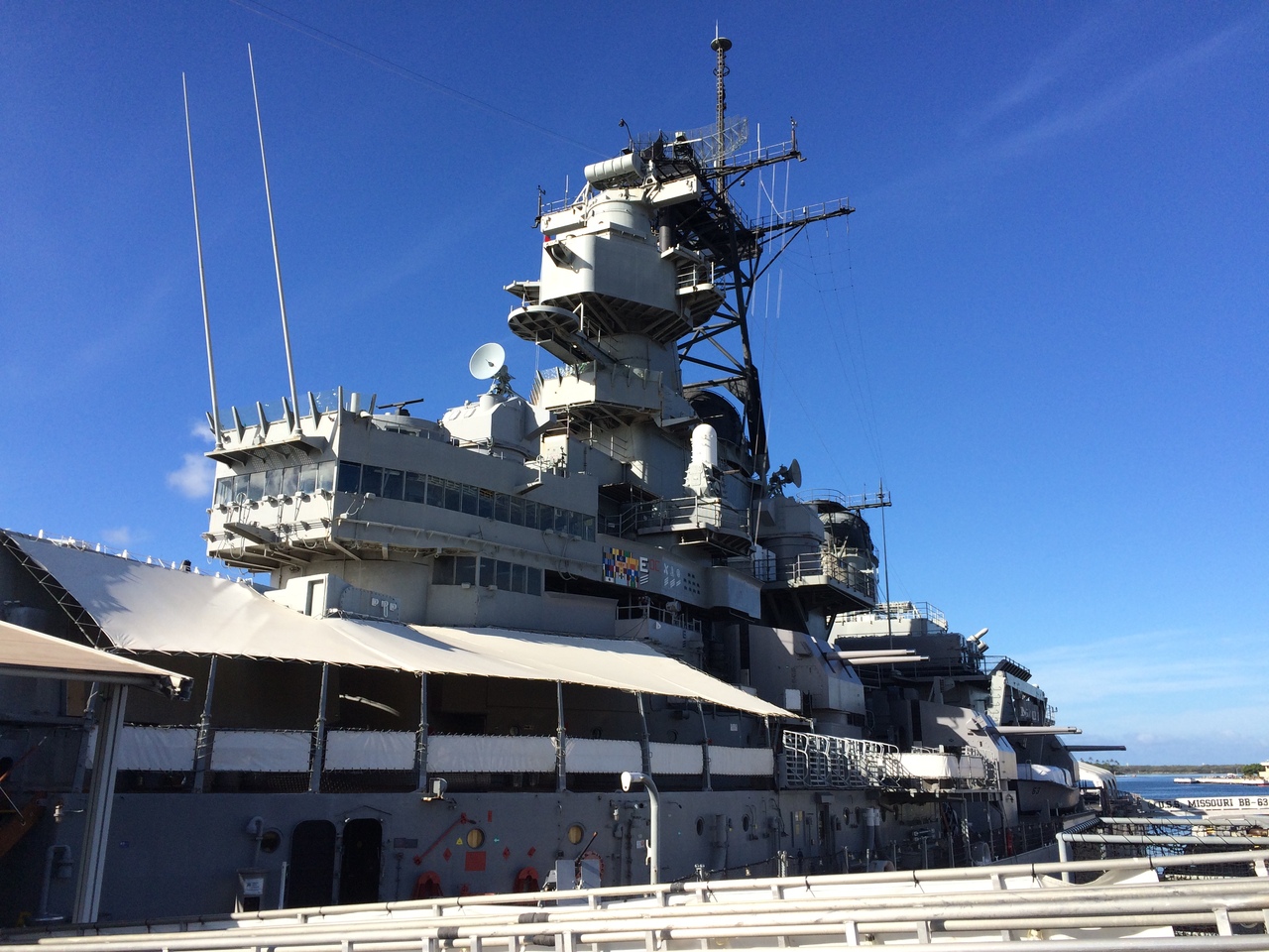ハワイ、オアフ島のパールハーバーに停泊している戦艦ミズーリ。現在は、記念館として公開されていますが、1994年の湾岸戦争まで現役で活躍していた戦艦です。