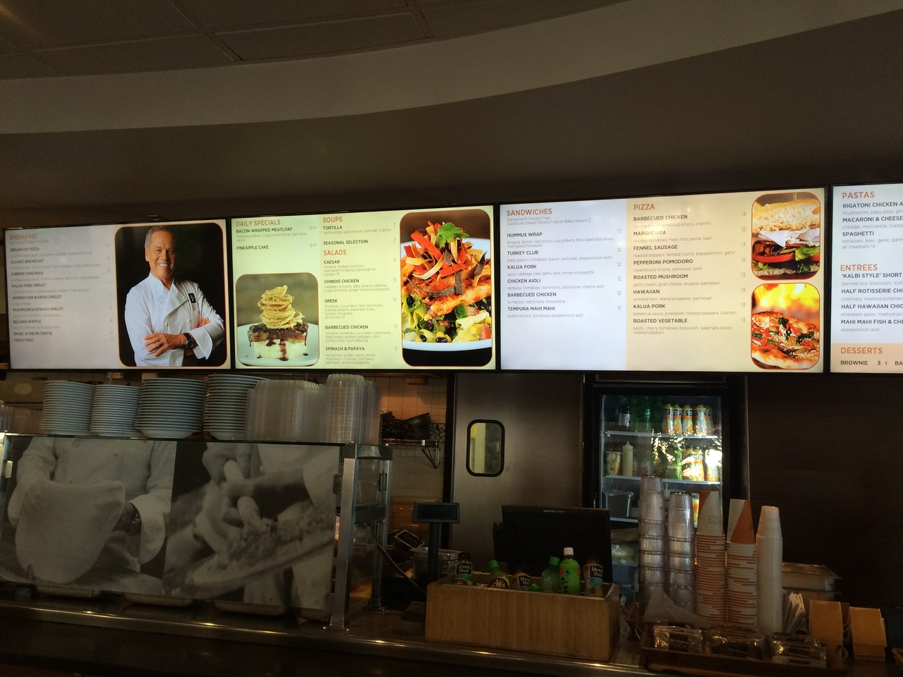 ラーメンやロコモコ、カツカレー、丼ぶりものなどがありました。イスとテーブルが並んでいますが、セルフサービス形式なので、レストランという感じはあまりしません。