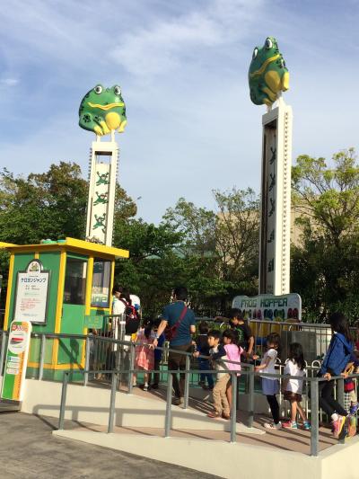 カエルになった気分でジャンプする乗り物です。ウチの子は、上にあがるアトラクションが好きなのですが、これはちょっとしか上がらないので物足りなさそうでした。
