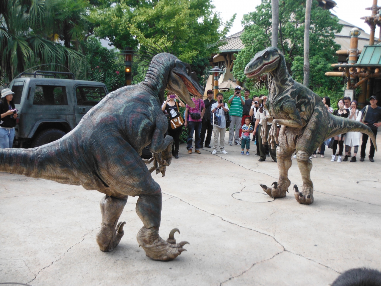 USJのジュラシックパークエリアで行われている恐竜のショーです。恐竜が脱走したという設定で、恐竜が現れます。