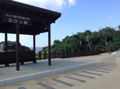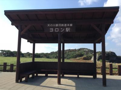 以前は、台風で看板が飛ばされてしまっていたようですが、現在は修復されて綺麗になっています☆しかも、待合室までできていました♪『天の川銀河鉄道本線 ヨロン駅』だそうです。奥に続く道に列車のレールが描かれていて、より楽しめる場所となったのではないでしょうか。