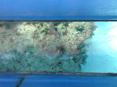大金久海岸から百合ケ浜に行くまでの間に、グラスボートで珊瑚礁の辺りを巡ってもらいました。上から見る分には、珊瑚礁の綺麗さがあまり分からなくて残念。きっとシュノーケリングをしたらその綺麗さが分かるのだろうなぁと思いました。