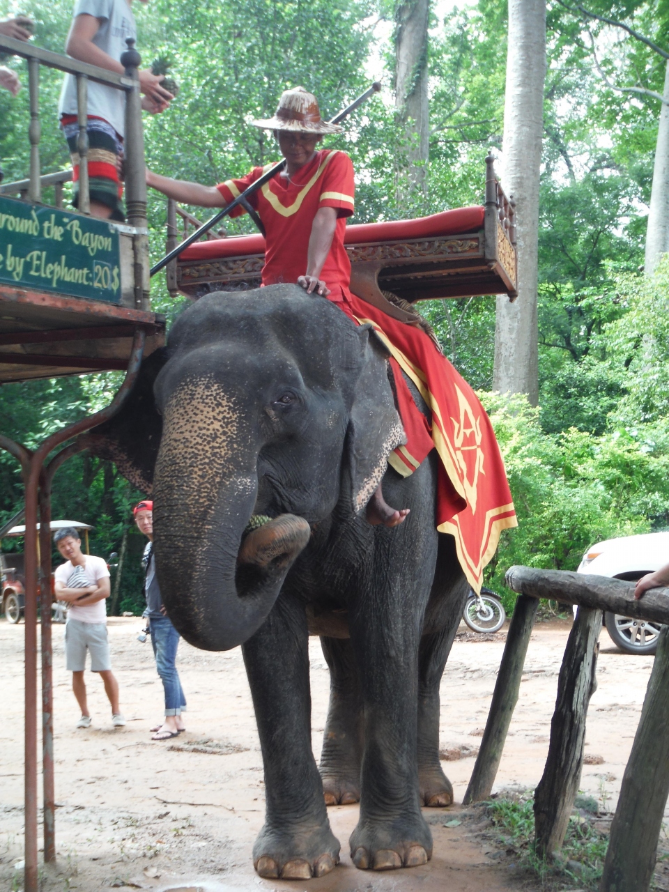 象さんに果物のパイナップルをあげることもできました。1つ1ドルです。それと、画像は雑ですが、1枚1ドルでバイヨンをバックに象さんに乗った写真も撮ってもらえましたよ☆- 旅行時期