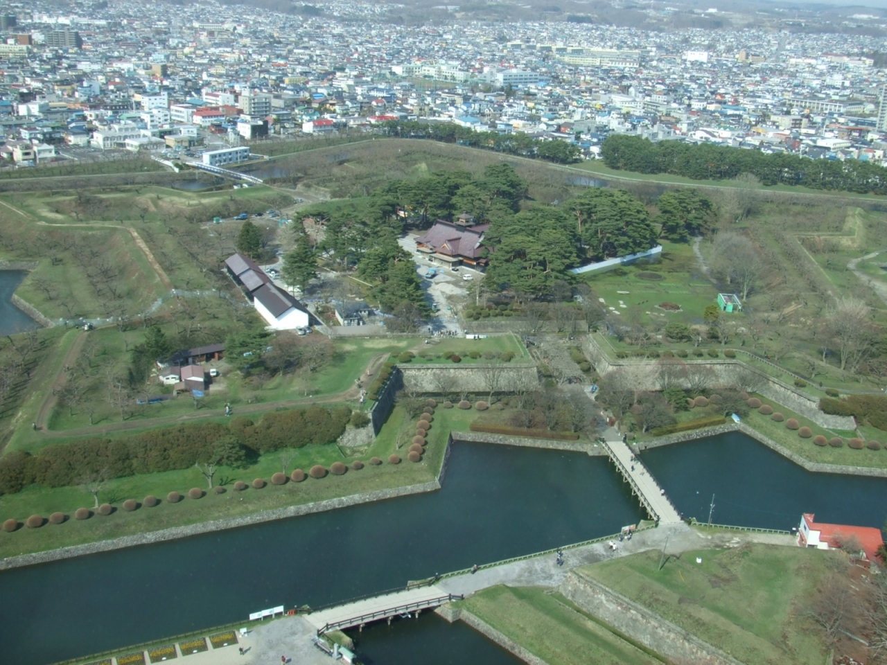 五稜郭は、国内初の西洋式城郭で、星型の城郭は、防御側の死角が少ないなどの利点があって、このような形の城郭を作ったそうです。
