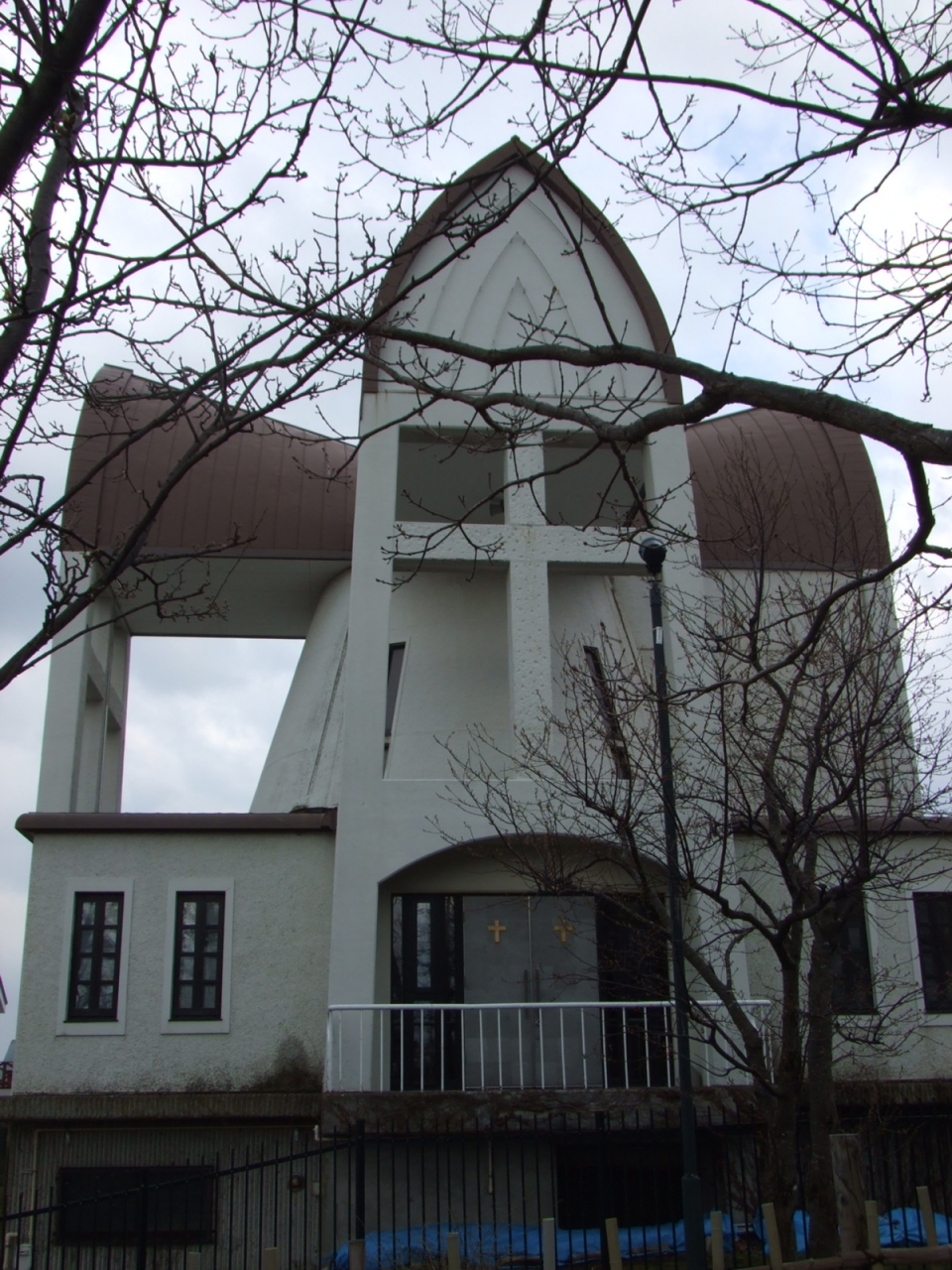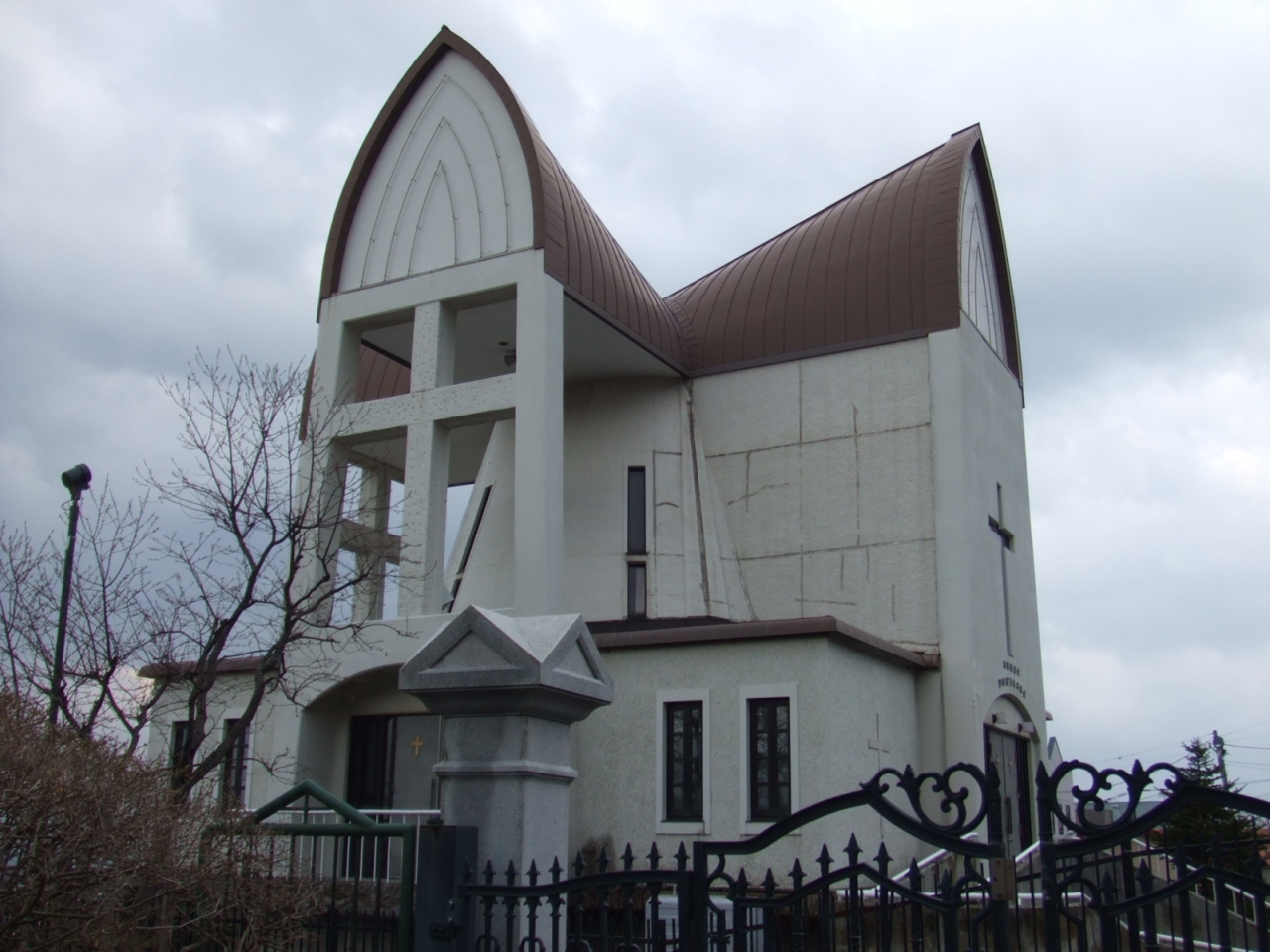 函館の元町エリアにある教会です。この教会は、上から見ると十字の形になっているそうで、地上から見ると変わった形をしています。でも、それがインパクトになっていますね。