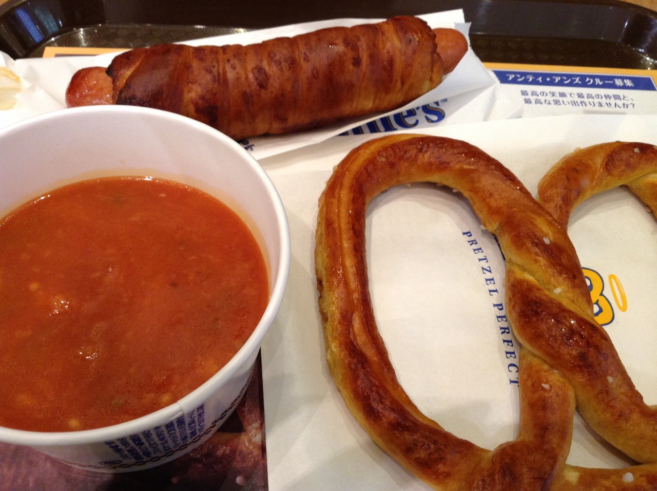 プレッツェルはサクサクしていてすごく美味しかったです☆ただ、スープセットだと安くなるので、ミネストローネとのセットにしたところ、このスープが濃すぎて全部飲むのがツラかったです。