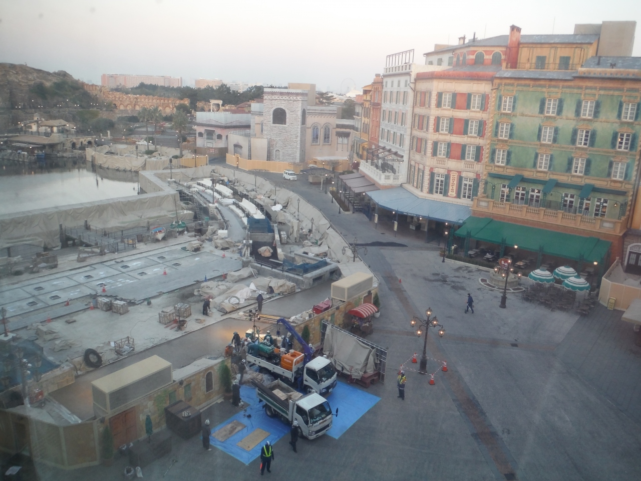 2015年1月現在、メディテレーニアンハーバーのミッキー広場周辺が改装工事が行われていました。港を埋め立てて小さくして、ミッキー広場を大きくするようです。