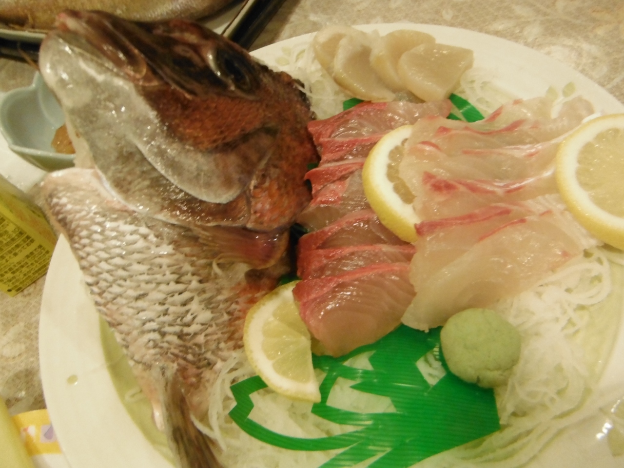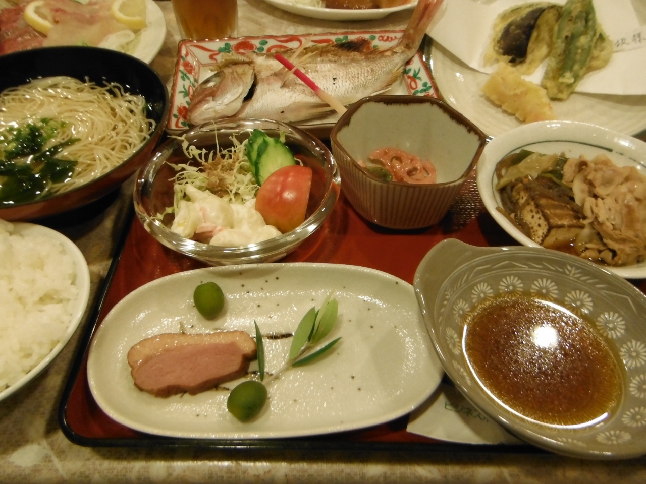 夕食もとても豪華で、お刺身が新鮮で美味しかったですし、私の大好きなタイの塩焼きもついてきて、とっても幸せでした。小豆島のそうめんも美味しく、子供達もパクパク食べていました。夕食は建物前の『ニューポートホテル』で頂きました。系列のホテルのようですね。