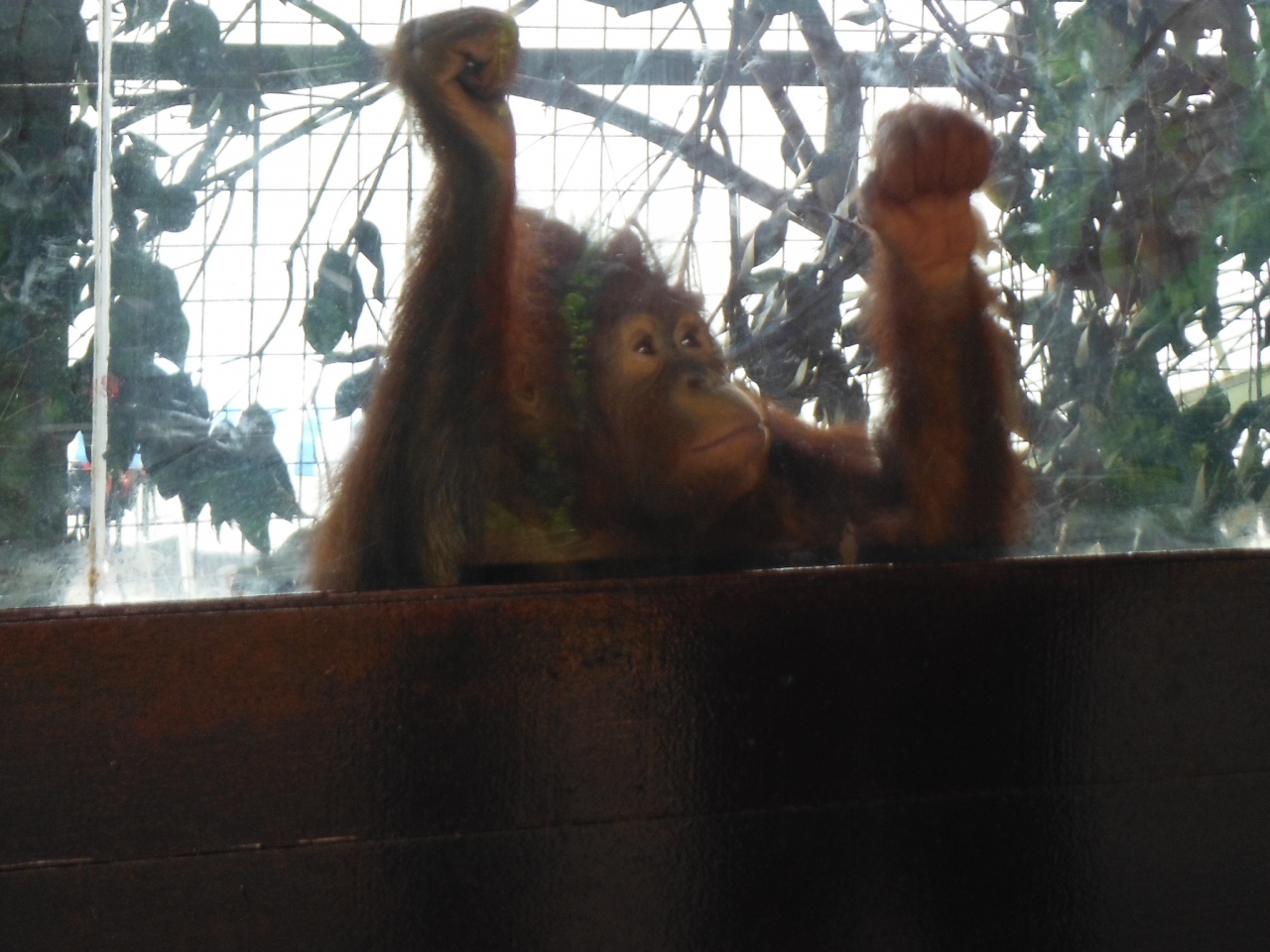 子供の3頭のオランウータンは、別のアクリル板の飼育部屋で飼われているので近くで見れます。飼育員さんや添乗員さんは、『めずらしいでしょ?これがオランウータンだよ~』って感じなのですが、日本でも見れるのでわざわざ見に行かなくても良かったかな?というのが、正直な感想です。