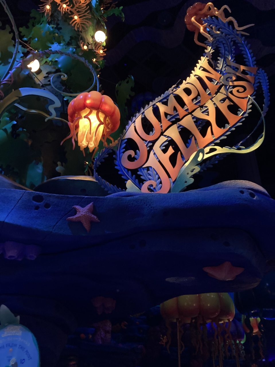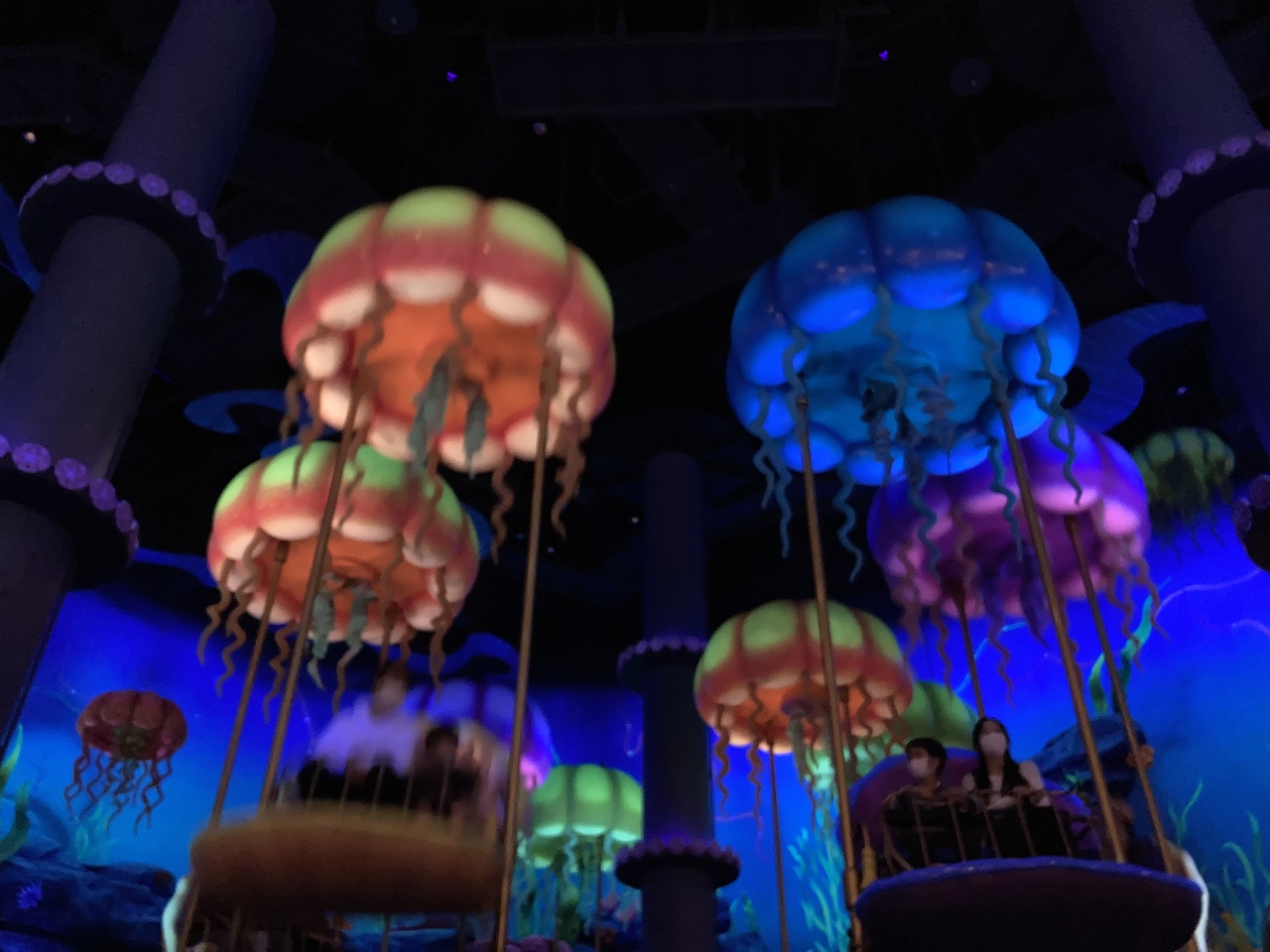 ディズニーシーのマーメイドラグーンにあるアトラクション。クラゲに乗って、上下に動くのですが、ゆっくりで回数も少なく、すぐに終わります。