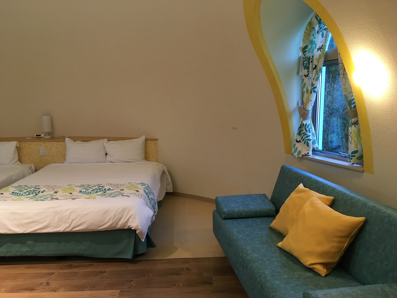 パンダの絵が描かれていて、とっても可愛いです。可愛すぎて、大人でもテンション上がります!部屋も広くて快適なのですが、夜は、雨の音が響き過ぎて何度も起きました。