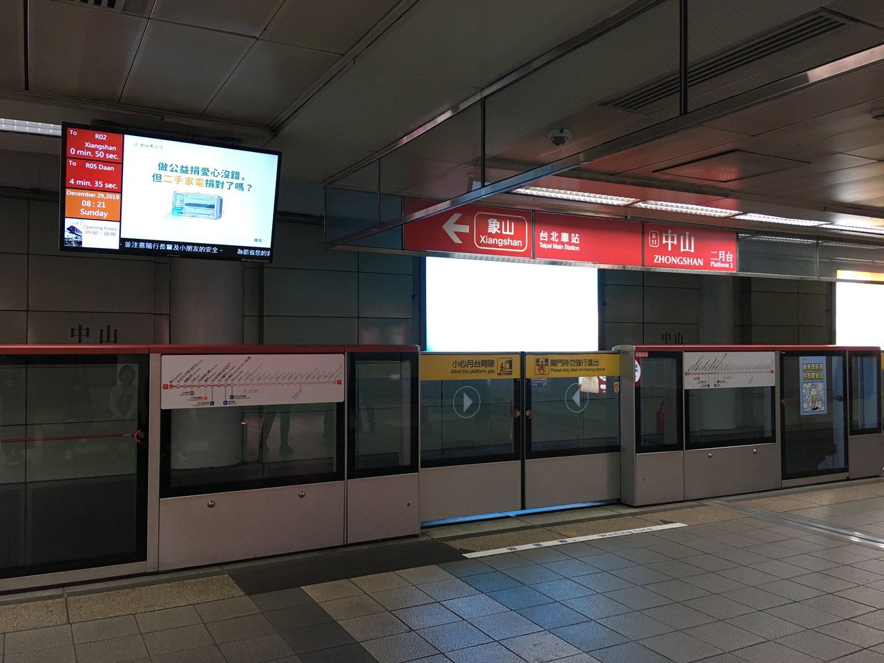 地下鉄の赤ライン淡水信義線から紫ライン桃園捷運機場線へ乗り換えました。台北に到着したときに、間違えて緑ラインの北門駅に歩いて行ってしまったので、次は赤ラインで・・・と思っていたら、赤ラインから紫ラインへ行くのも遠かったです。