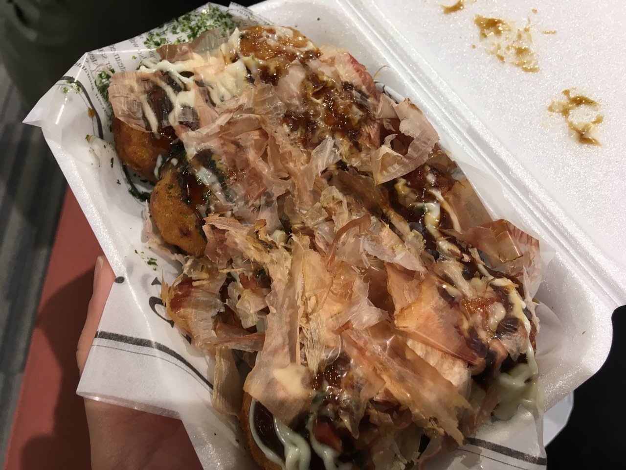 たこ焼きや焼きそばを購入しました。持ち帰り用にしてもらうと飛行機内に持っていけるので便利でした。