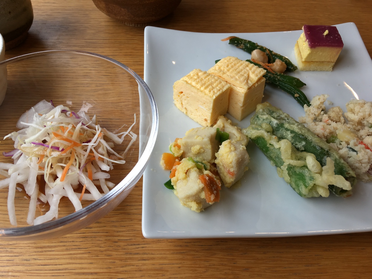 以前からおばんざいビュッフェが気になっていて、時間ができたので行ってきました。おばんざいが8種類くらいあって、それが食べ放題です。メインの料理を4種類から選ぶのですが、豆腐ハンバーグもとんかつもとても美味しかったです。デザートも3種類くらい置いてありました。