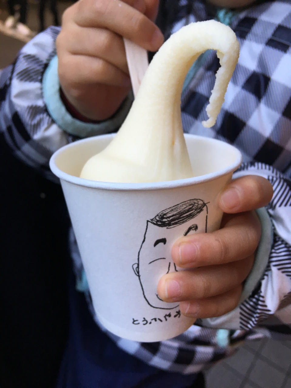 豆乳ドーナツの他には、豆乳ソフトクリームもありました。子供が食べたいというのでこちらも購入。食べた後に豆腐の香りが少しだけしますが、食べやすくクセもなくて美味しかったです。