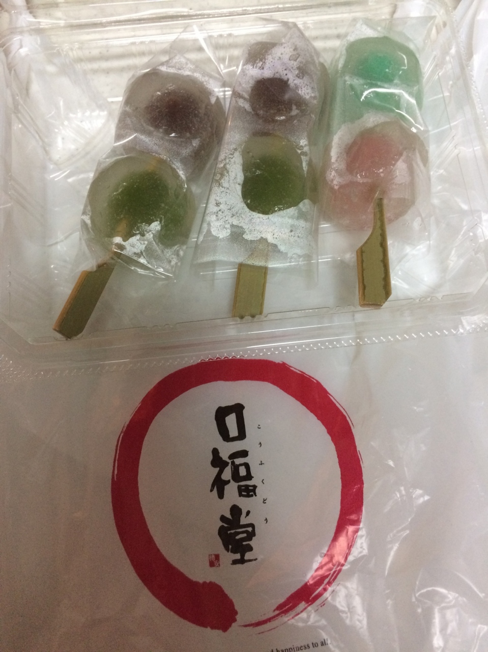 私はここの鬼まんじゅうが大好きですが、今回は、くずもちを食べました。中にあんこと抹茶あんが入っているくずもちと、ラムネ味と桃味のくずもちを食べました。