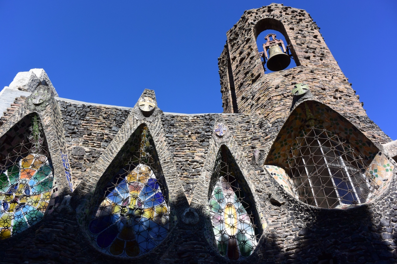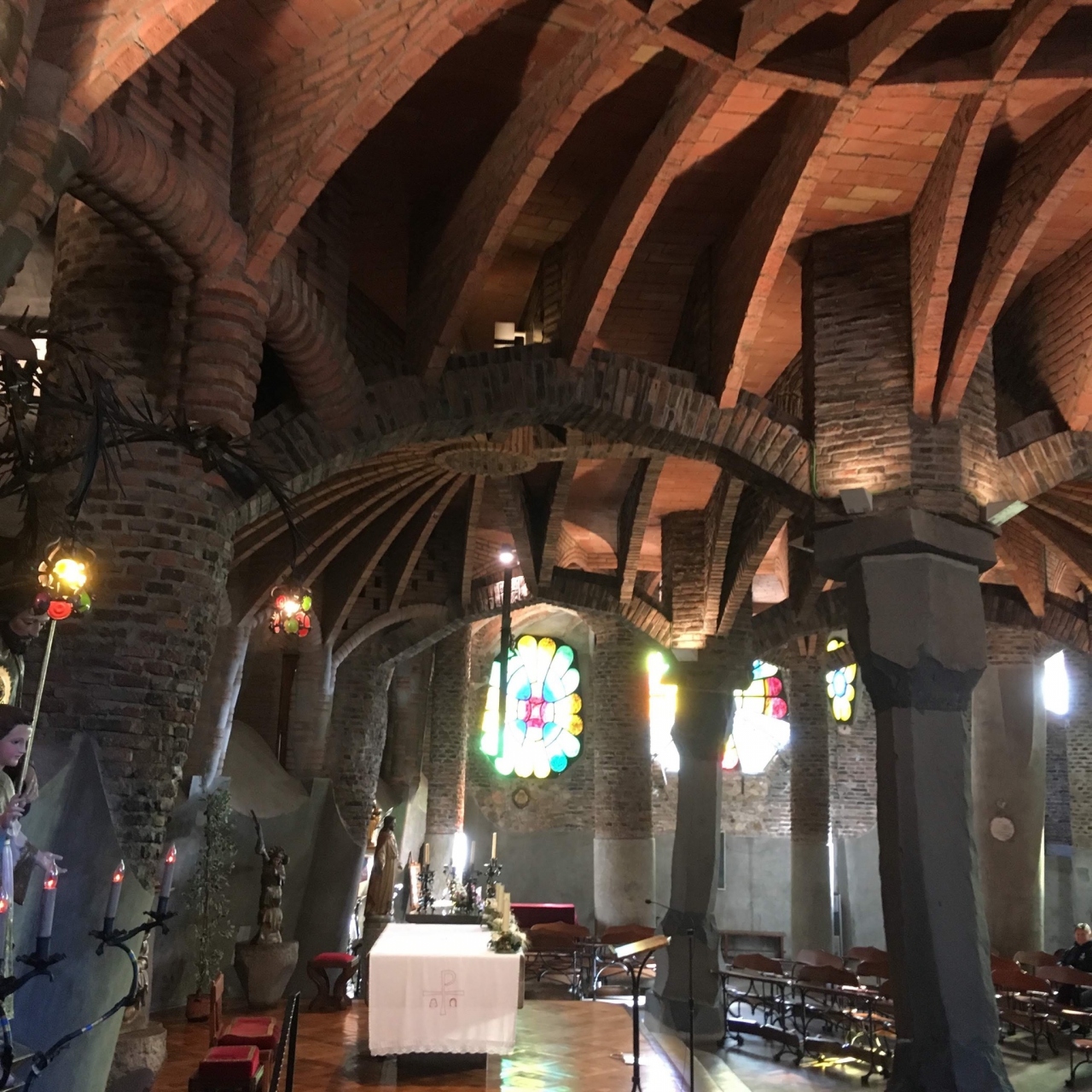 周辺一帯が織機工場を中心としたコロニア地区で雰囲気のある建物が点在、その中にグエル地下教会がある。まずは独特の外観に息を飲み、内部はアーチ状の張りとステンドグラスに圧倒され、ガウディワールドにどっぷり浸りました。