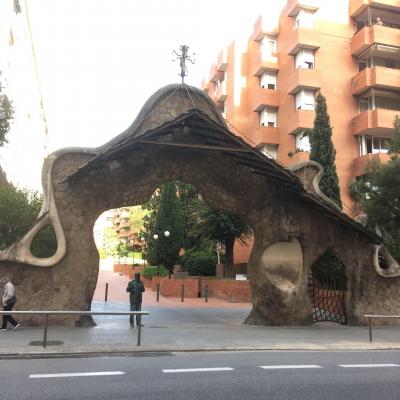 非常に不便な場所にありましたが、2階建てバスのルート(barcelonabusturistic blueline)だったので寄ってみた。カンプ・ノウに近いビル街に突如現れた異様な建造物。明らかにガウディ作品と分かる外観は周りに溶け込んではいない。なぜここに?なぜこれだけが?といった感じ。無機的なビル街に有機的な石門はある意味面白い。
