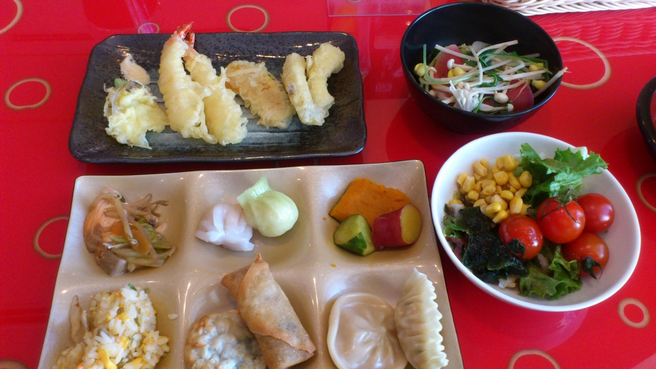 飲茶、てんぷら、野菜しゃぶしゃぶ、サラダなど、デザートもあります。ソフトアイスやチョコタワーなど子供も楽しめるものがありました。