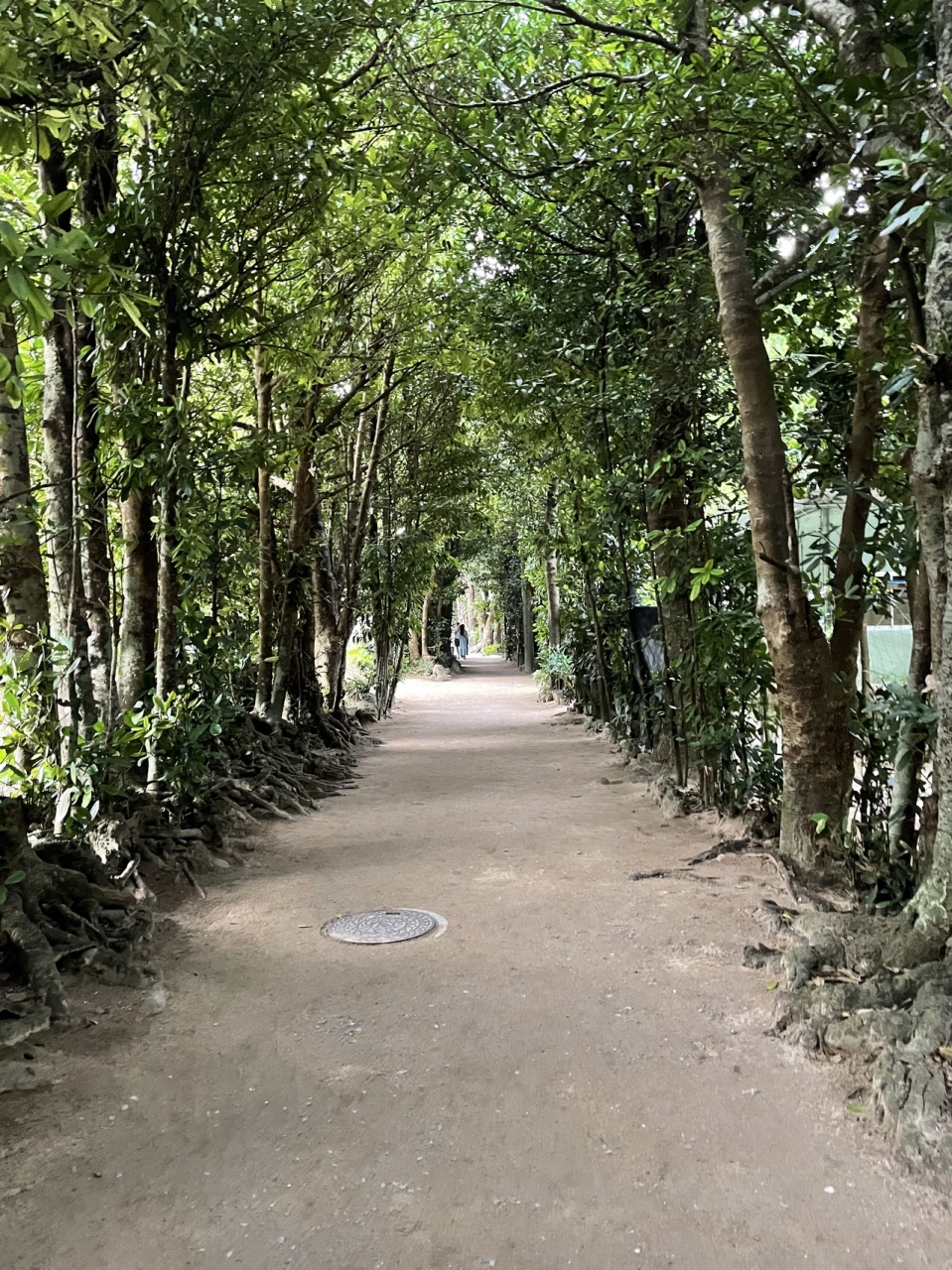 車を停めて小さな看板に従って歩いていくとフクギ並木にでました。森の小道みたいでトトロの世界のようです。