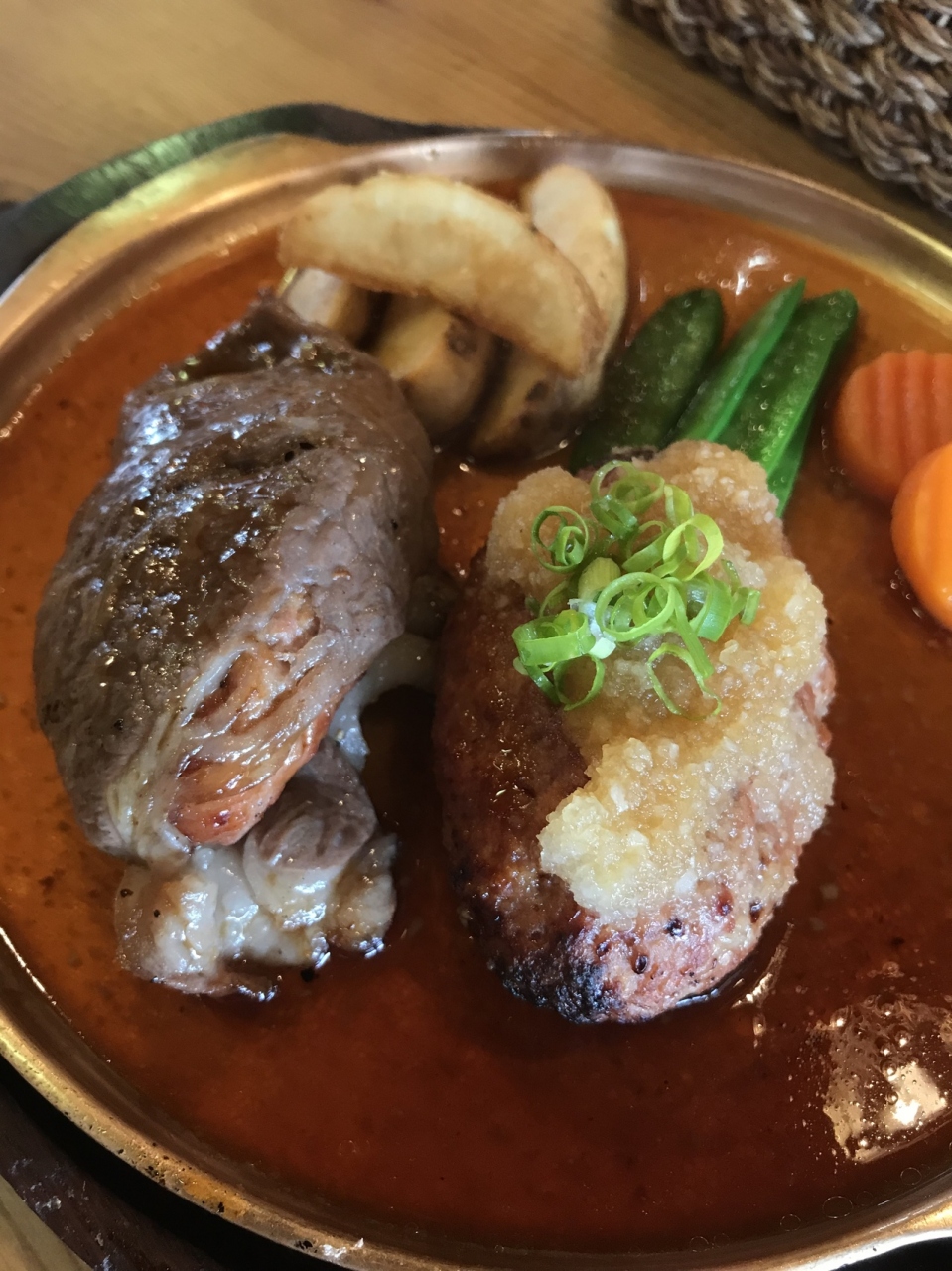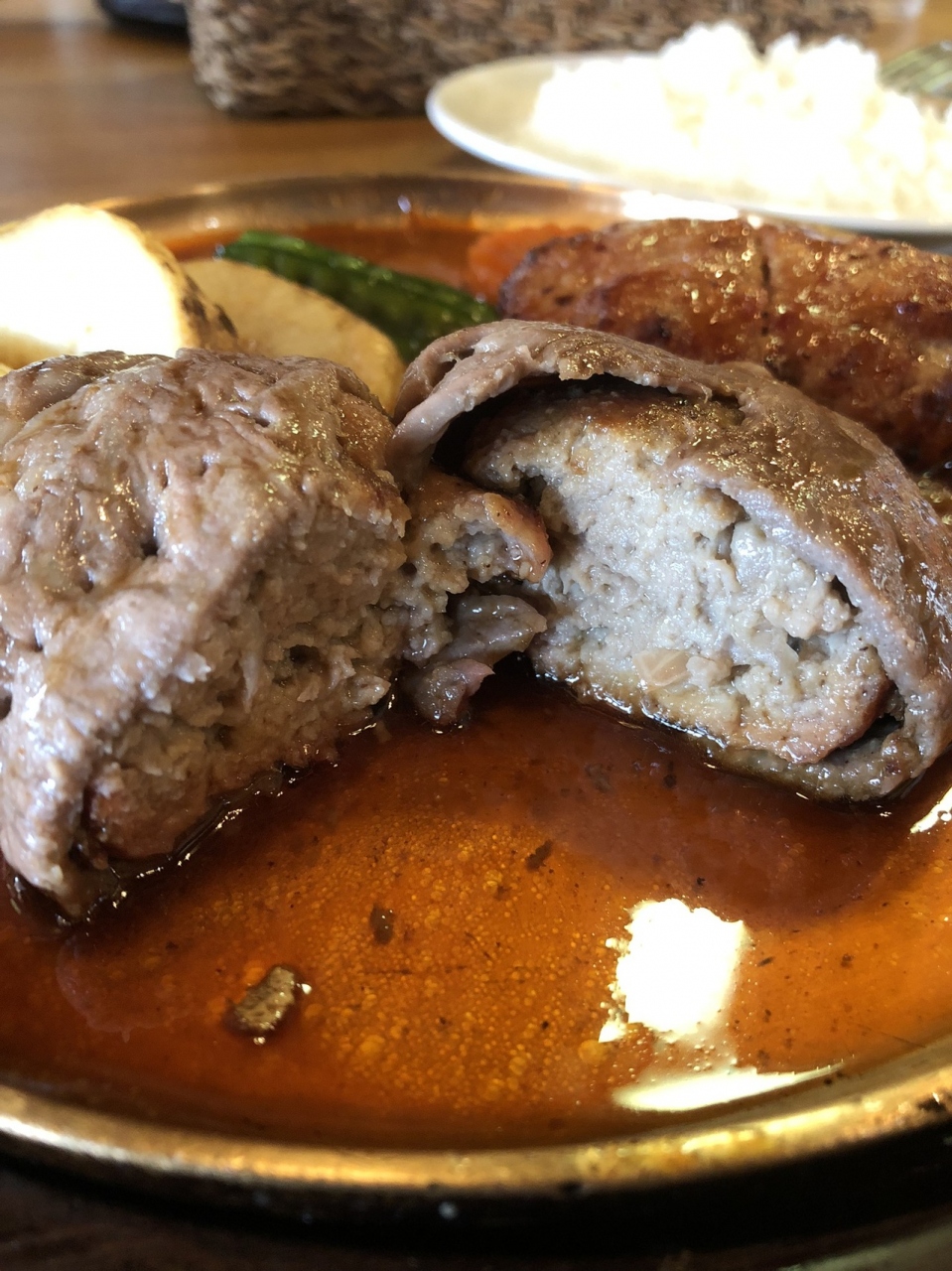 名物のお肉で巻かれたハンバーグと普通のハンバーグのセットを注文しました。