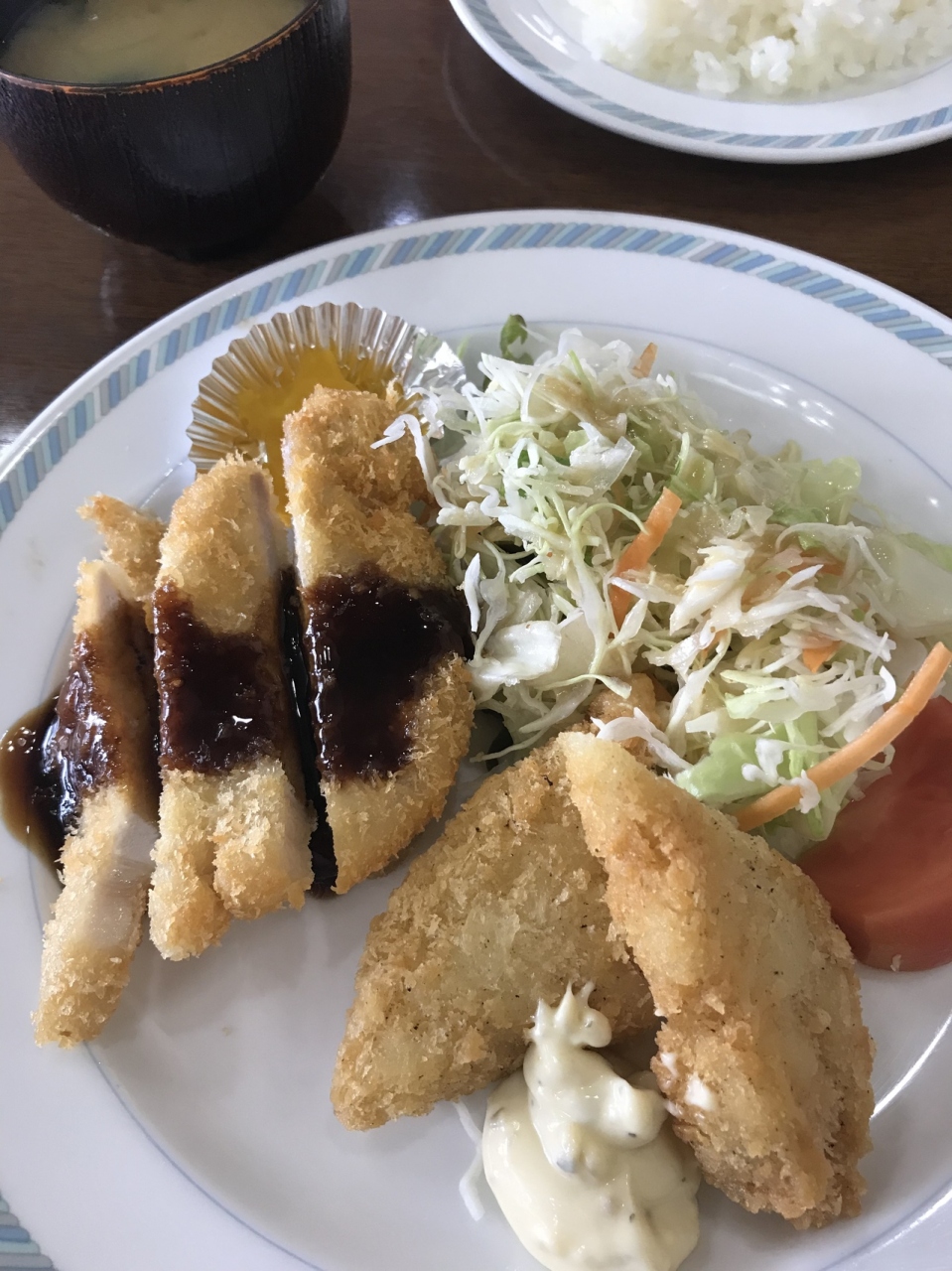 魚のフライとトンカツでした。お肉は薄かったけど柔らかくころもはサクッとしていて美味しかったです。