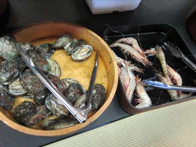 カニ、あわび、えび、刺身などが盛られたお皿がどーんとありどこにとりに行きます。