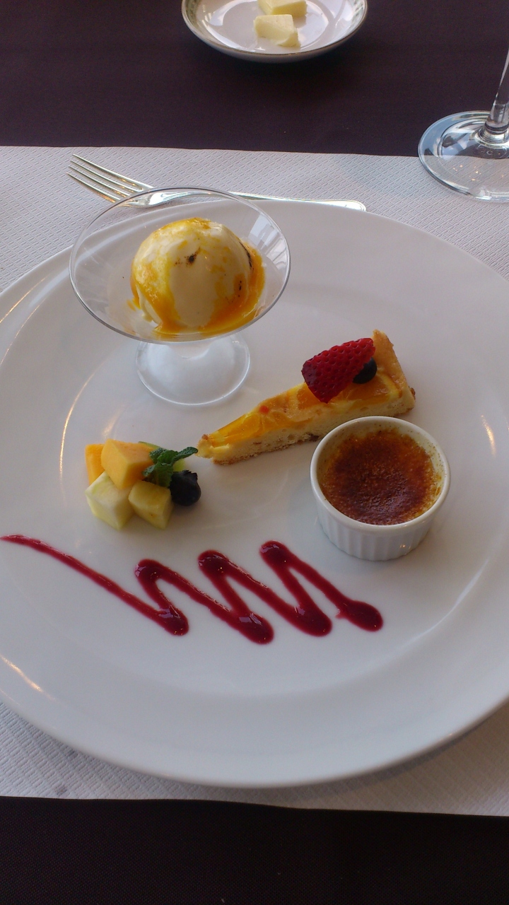 デザートプレート・・・バニラアイス、オレンジのタルト、ブリュレと色々あり甘いものがそんなに好きじゃない私もとっても美味しく頂けました。