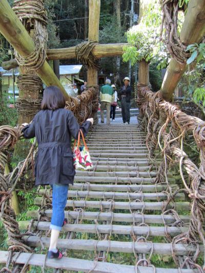 橋はつたで編んだような橋で短いですがギシギシきしみ、あみ目がとても大きいので