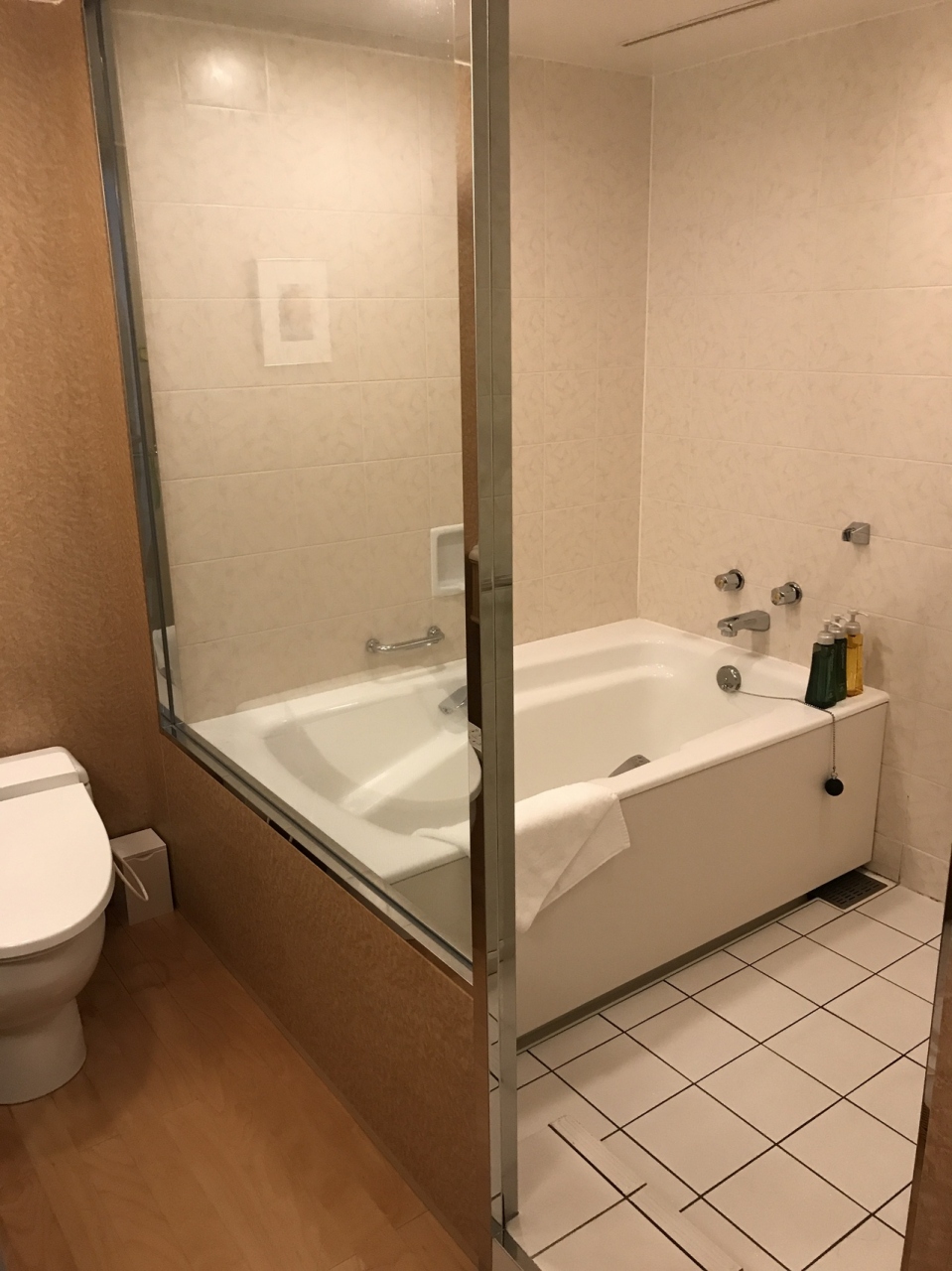 お風呂は洗い場付き、トイレとは別ですがガラス張りで区切られているだけなので、お風呂の途中で他の人がトイレに入るのは気がひけるかな。