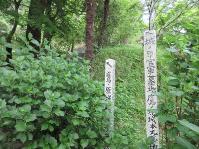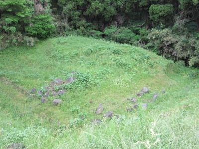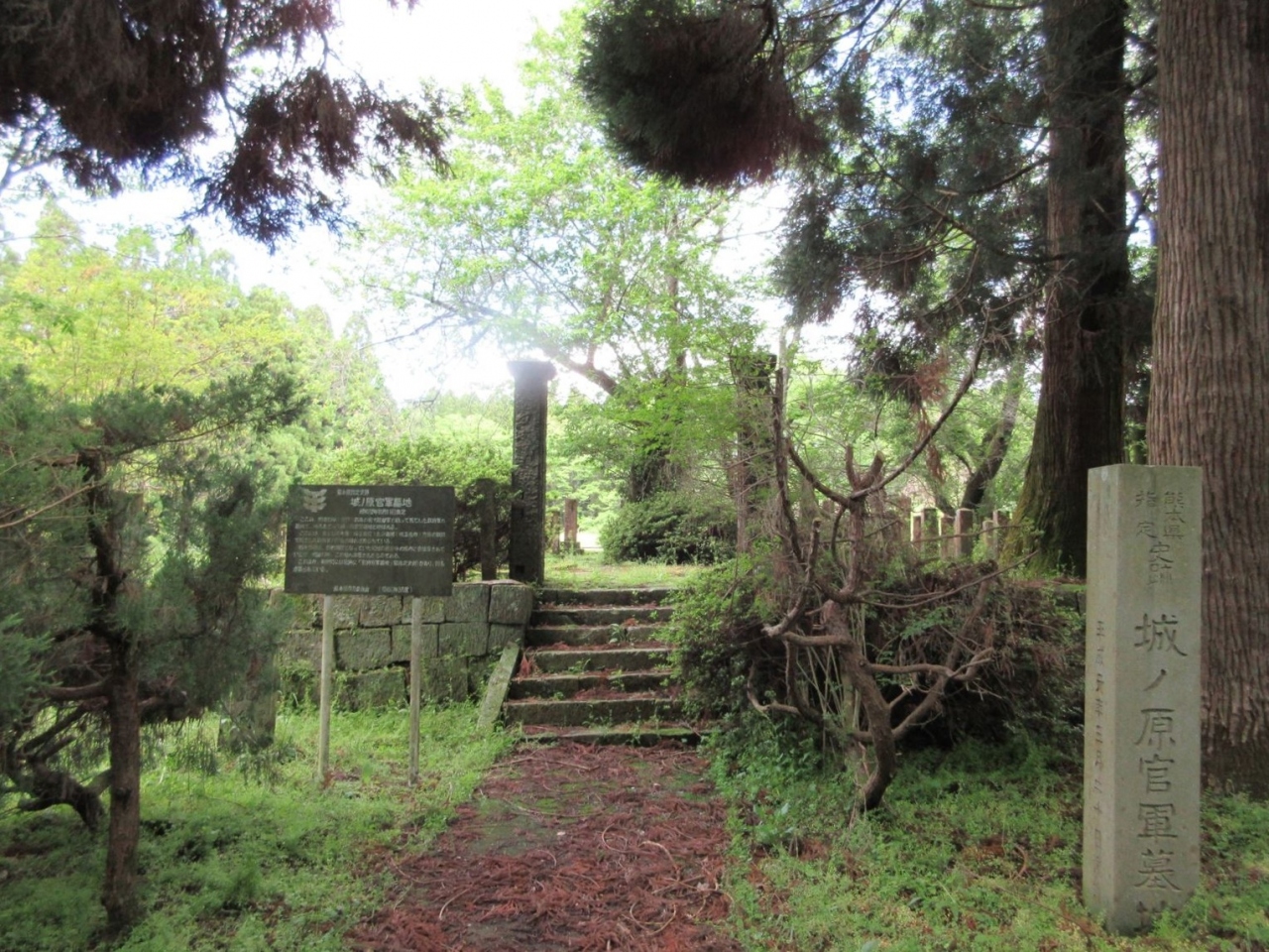 道を上がると、一応整備されていますが、その状態はあまり良くなく、足元に注意が必要です。山の上には城ノ原官軍墓地があり、その先が本丸跡となっています。一ヶ所、石垣らしきもの(巨石が並んでいる)がありましたが、城址の雰囲気はあまり残っていないように思いました。