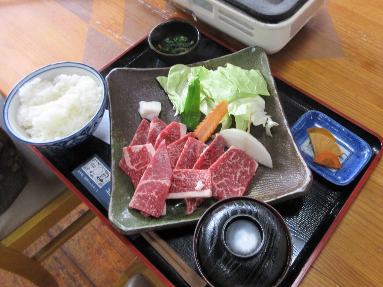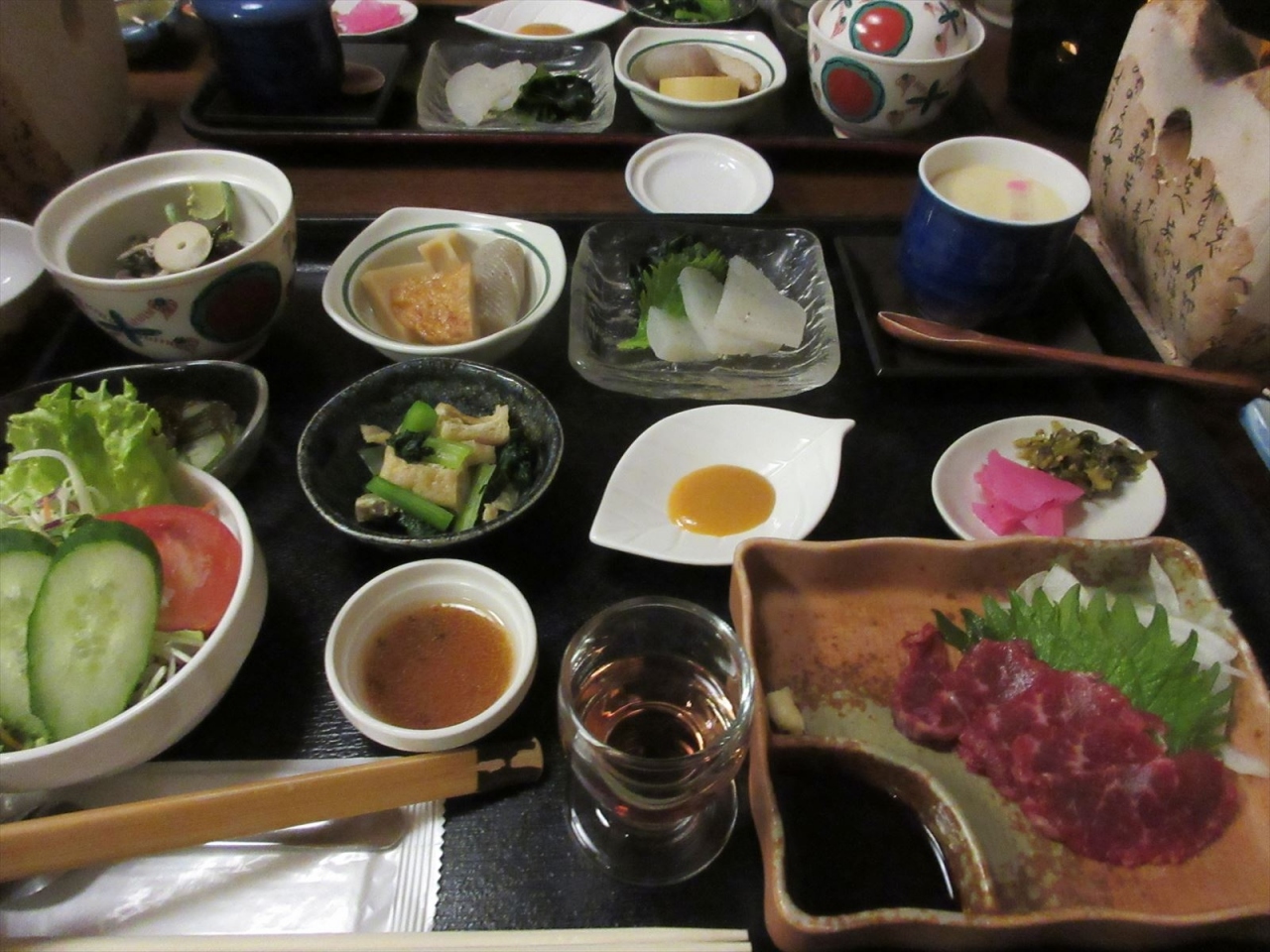 食事は食事会場で取り、夕食が18時から、朝食が8時からに決まっており、夕食は黒毛和牛に豚しゃぶ、馬刺しに山女魚など、食べきれない程出てきて、すべてが美味しかったです。