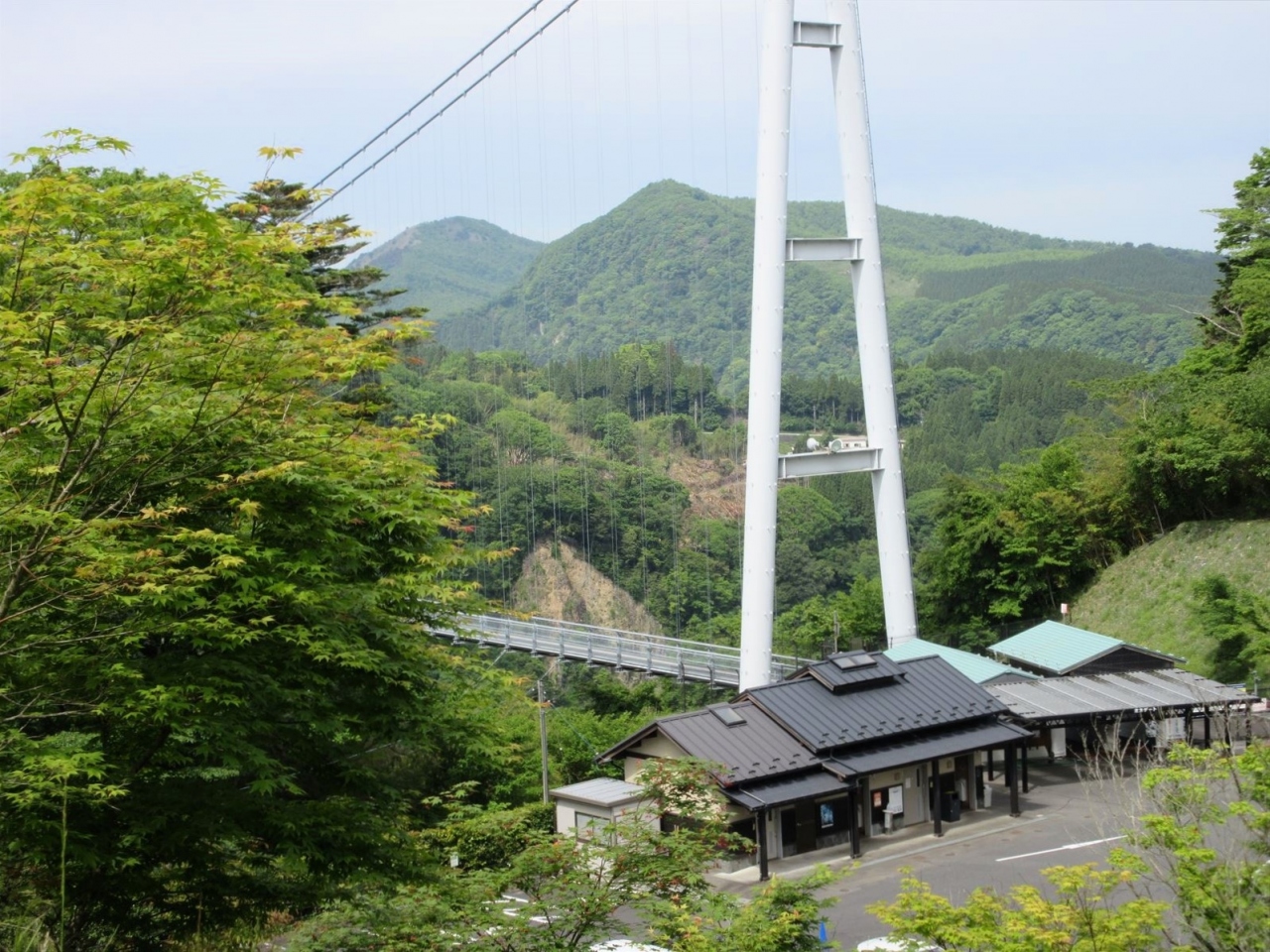 一方、反対側の北方エリアのゲートですが、駐車場(中村エリアに比べると小さい)のすぐ前がゲートになっており、橋まですぐにアクセスできます。しかし、それ以外は何もありません。ただし、駐車場・ゲート付近から階段があって、上がると白鳥神社展望台があり、ここから吊橋や周囲の風景が眺められます。また、その周囲には飲食店や土産物店が数軒集まっていました。