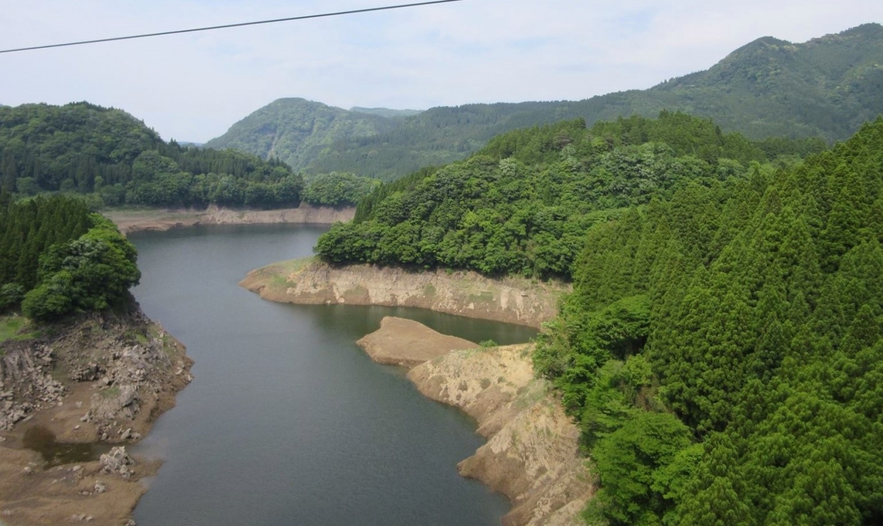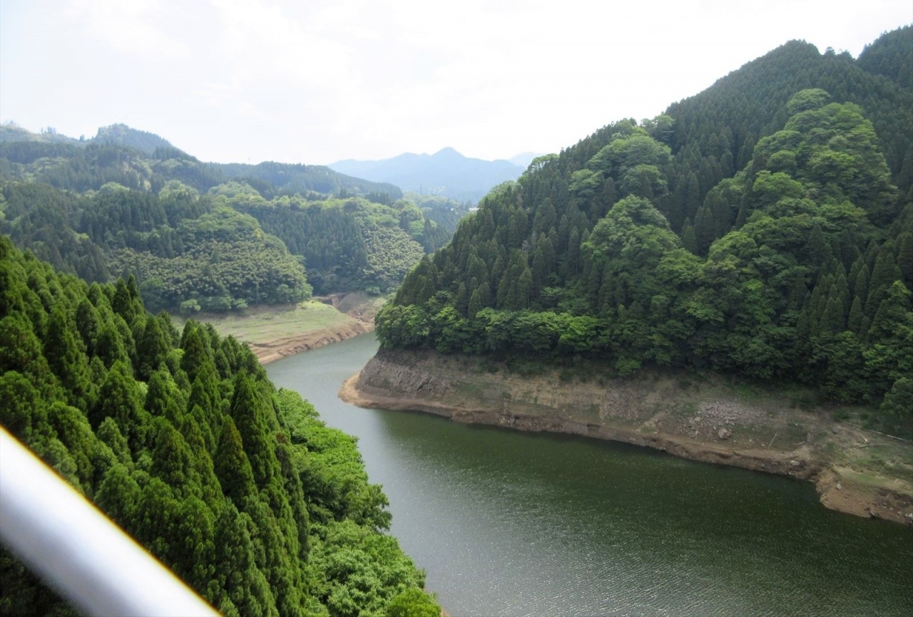 ダムは、小国町(熊本県)、旧上津江村・旧中津江村(大分県、現在は日田市)の境に建設されています。ダムの南東部分が旧上津江村の中心部のようでした。
