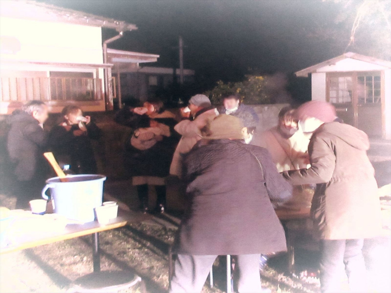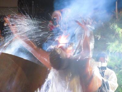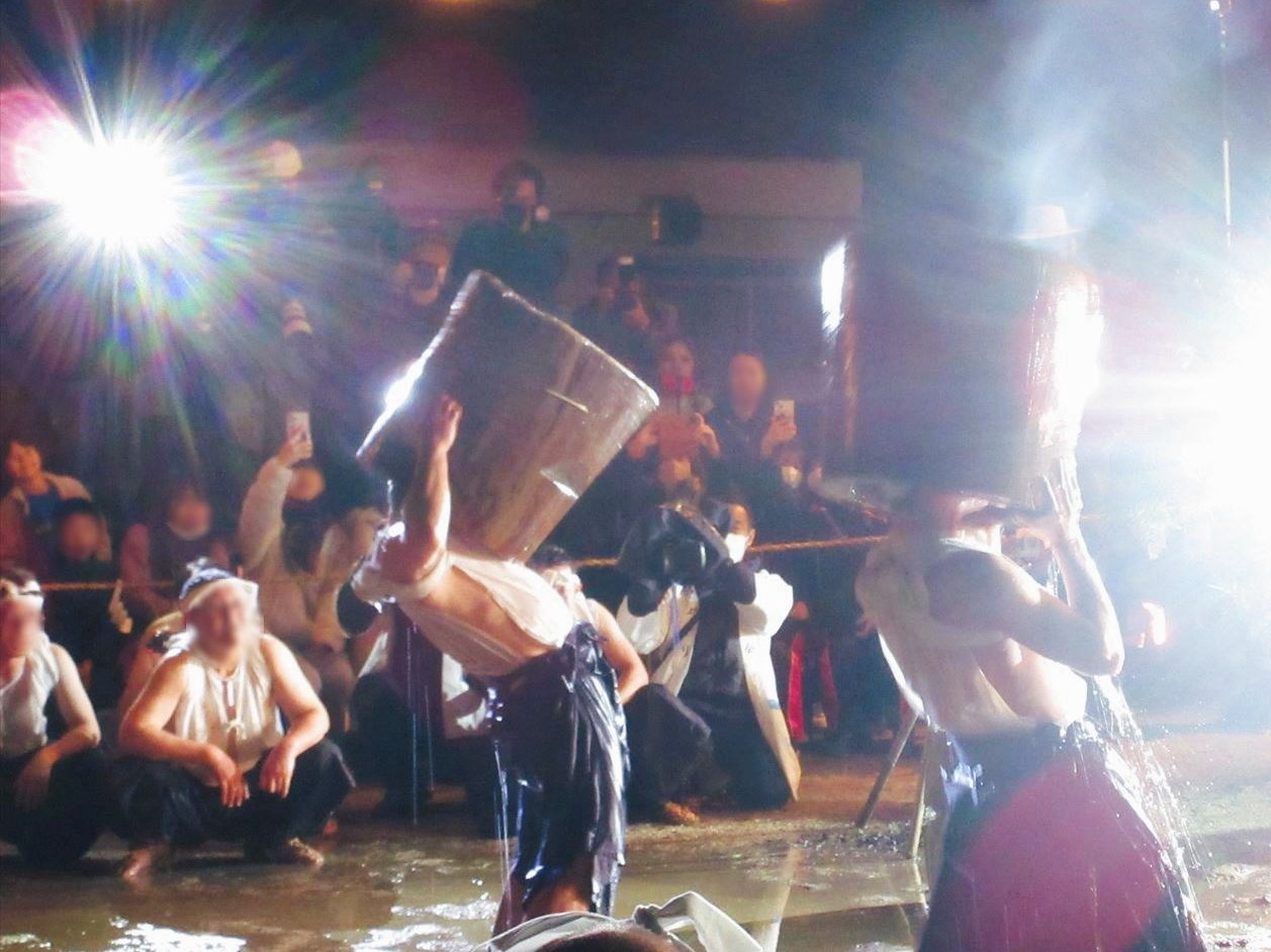 夕方から始まり、初めは子供がバケツの水をかぶり、その後、青壮年が水が入った臼を被り工法へ放り投げます。大きい臼だと水を吸って100kg近くになるそうです。