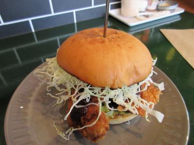 昼はランチでハンバーガーが出てきます。豚カツバーガーは脂がのった柔らかいバラ肉がサクッと上がり、お肉たっぷりで美味しくいただきました。