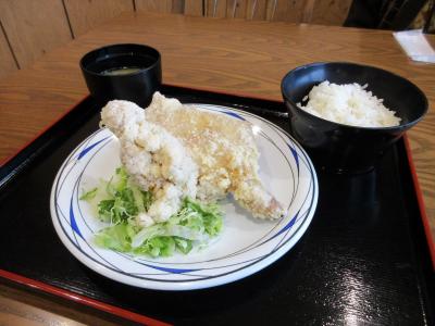 今回はランチで利用、名物のもも定食(鶏もも肉の一本揚げ)とメンチとり天定食を食べました。