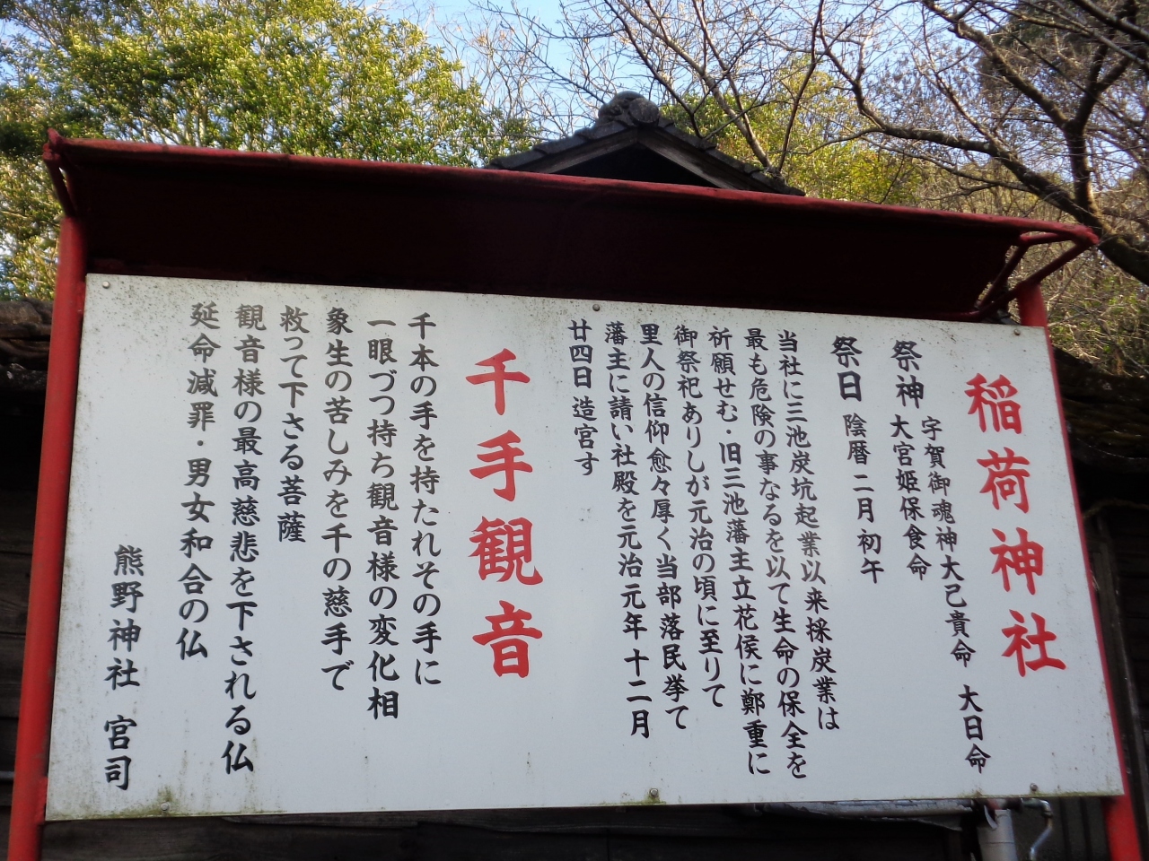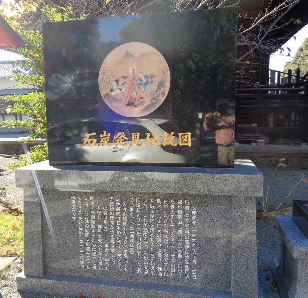 また、三池炭鉱の石炭の発見者とされる農夫・伝治左衛門もこの一帯の稲荷村(とうかむら)に住み、熊野神社の氏子だったそうです。三池藩の採炭も稲荷村で行われたことから、三池炭山の守護神とされました。