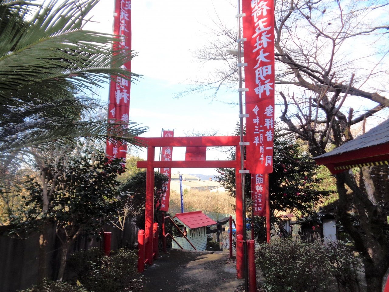 コンビナートの道路に幟が立っており、そこから東方向に進むと左手に駐車場があり、右手に神社があります。