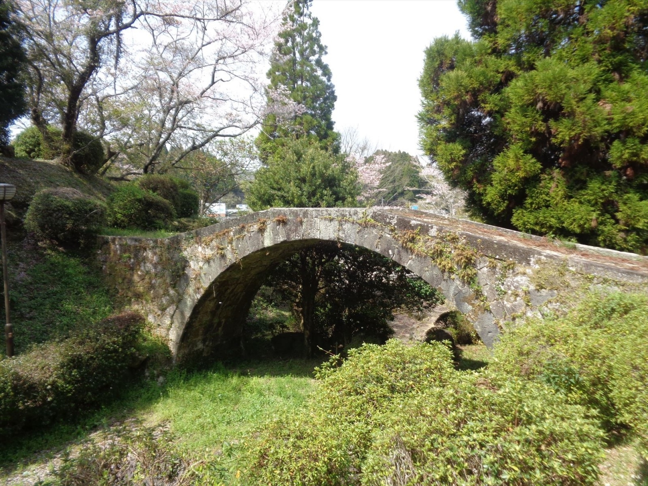三池陣屋橋は、同市の東南部・櫟野地区で採石される櫟野石(阿蘇溶結凝灰岩)を用いて建造され、櫟野地区の石工が関わったといわれます。小さな石橋ながら現在も生活道路として使用され、自動車も通る堅牢な造りです。