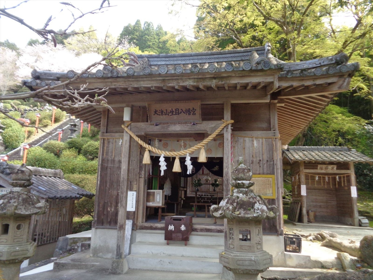 境内は山の斜面に展開しており、石段を上がって楼門と社務所、その上に生目神社、最上部に大津山阿蘇神社の拝殿があります。