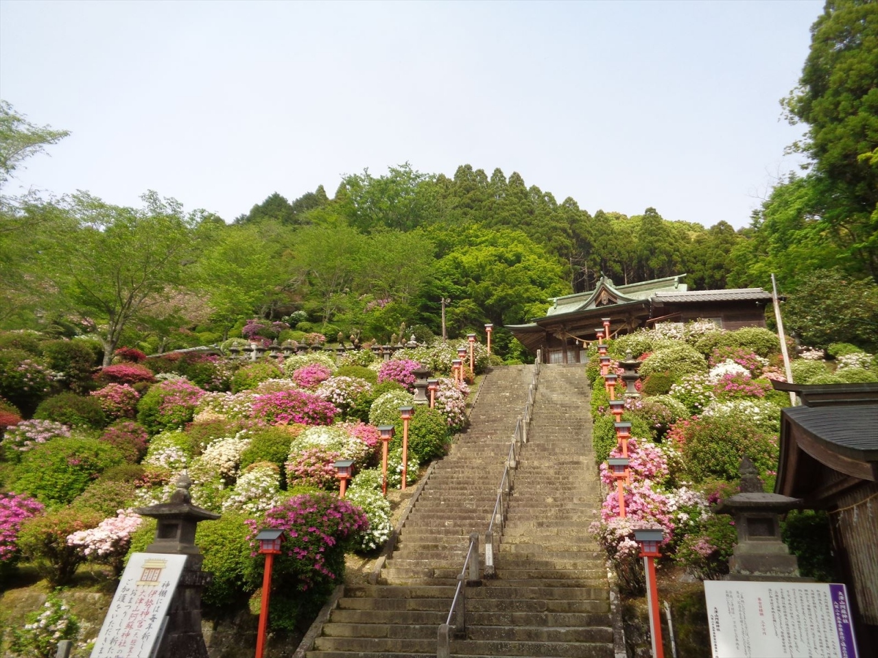 拝殿下の石段の両側一面に色とりどりのツツジが植えられています。桜も境内の至る所で見られ、大規模ではありませんが、神社の景色と併せて、とても良い雰囲気です。