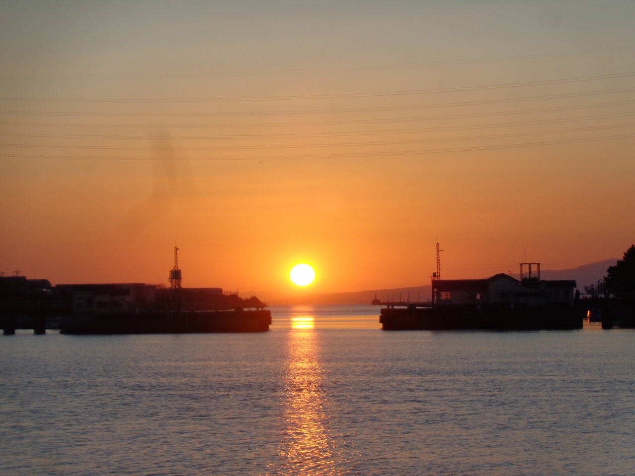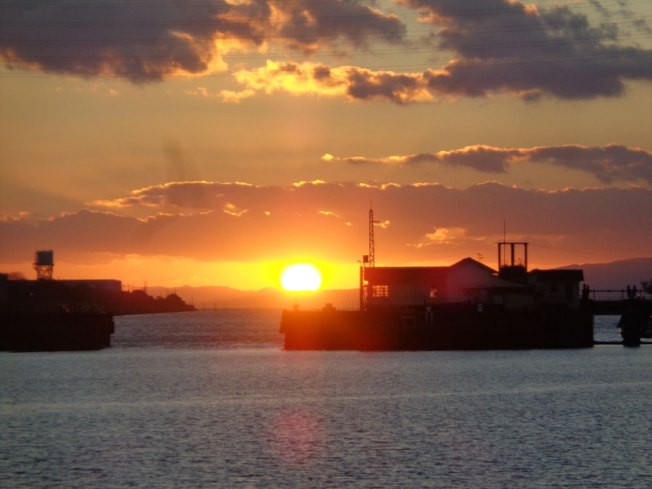 ここからだと、閘門の先から長い堤防で挟まれた航路から有明海まで見渡せ、そこに太陽が沈ところが撮影できます、