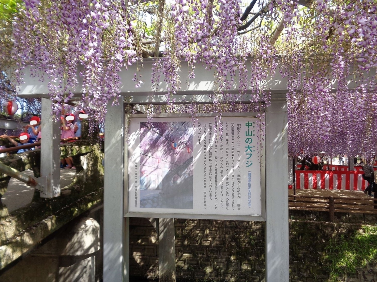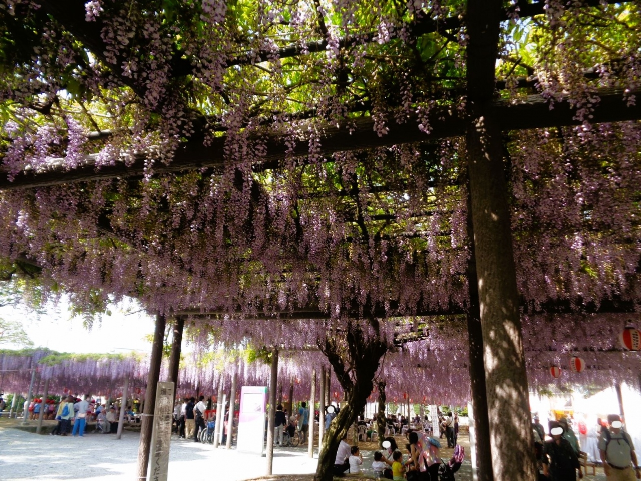 かなり大きい藤棚で、拝殿近くから奥の方まで続いているのにびっくり。見頃に訪れたからかも知れませんが、藤の花も長く厚く、昼でも花の下は薄暗いほどでした。また藤のトンネルも設けられています。