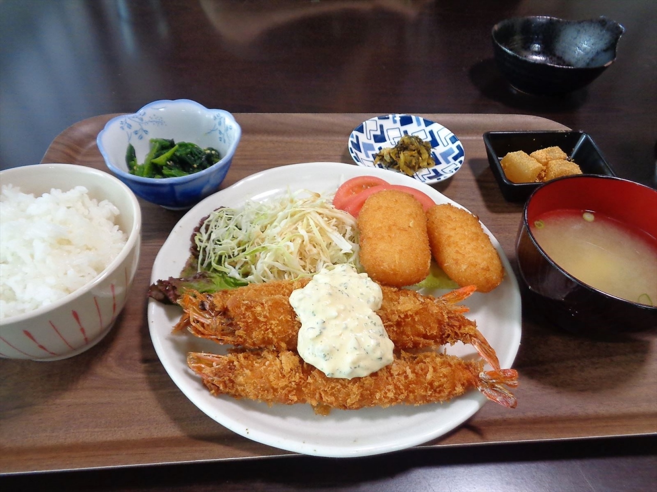 海老フライ定食(890円・税別)は、大きな海老フライが三つにクリームコロッケ二つでボリューム満点。屋ンニョムチキン定食(750円・税別)は甘辛い韓国風のタレがからんだ唐揚げが五つほどでお腹いっぱいになりました。