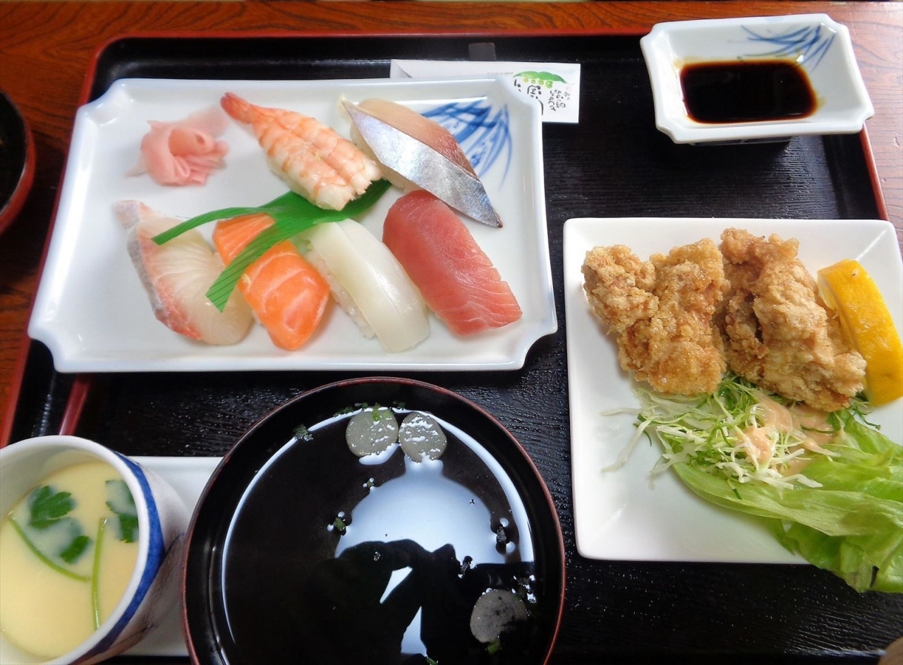 今回はランチで利用。寿司ランチ(1100円)はネタを選ぶことができ、サイドの料理も三種類から選択できます(今回は唐揚げにしました)。サラダ・茶碗蒸し付きでコスパも良好です。意外にも唐揚げが美味しかったです