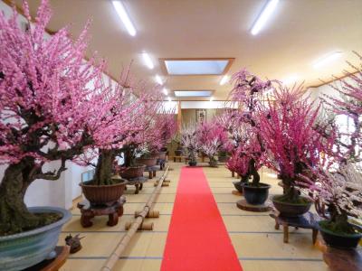 見どころは百畳敷の広いお座敷を埋め尽くすように展示される盆梅。一般的な小さな盆栽ではなく、大きいものは人の背丈よりも高いような見事な盆梅です。お座敷でありながら梅林の中にいるような不思議な気持ちになりますが、梅の花の見事さと香りに圧倒されます。