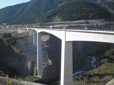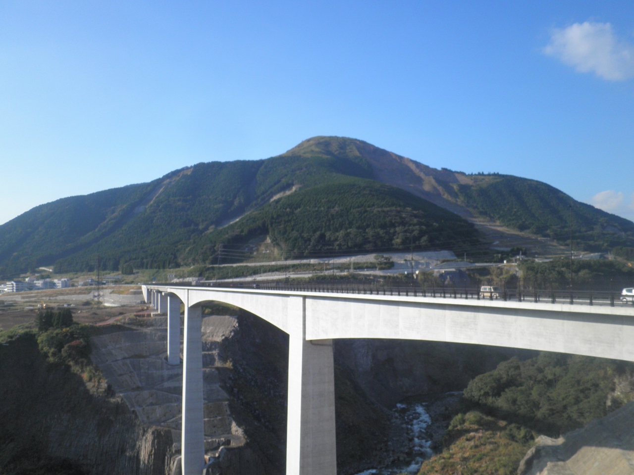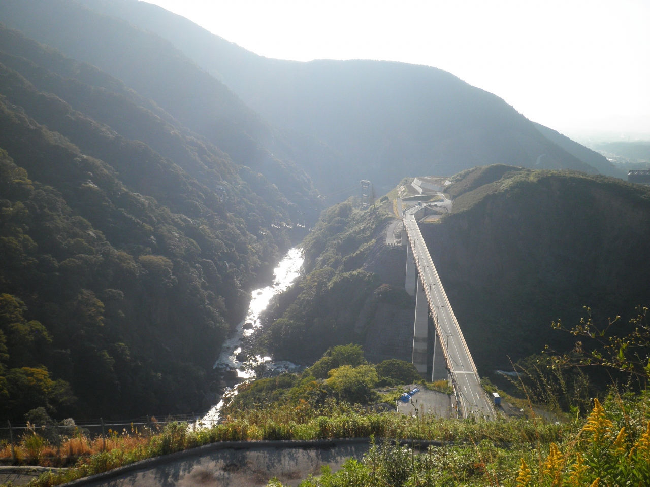 展望スペースからは、深い渓谷の上にいくつもの長い橋脚支えられた新阿蘇大橋の姿、長陽大橋、南阿蘇方面の雄大な景色などが見られます。