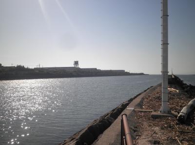 高速船乗場からさらに進んで北防砂提の手前にある旧海水浴場付近からは、南北の防砂提に挟まれた細長い航路と、内港の景色が見られます。